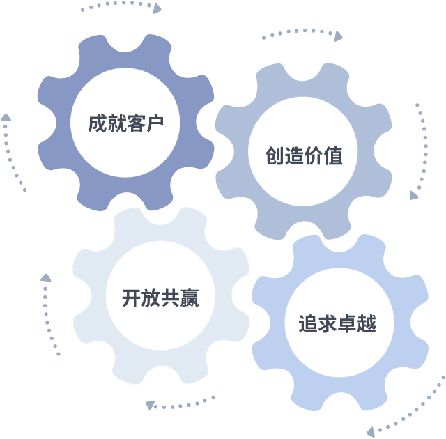 成就客户是一切决策的出发点,,,,创造价值是衡量所有工作的标准,,追求卓越是我们做事做人的态度,,,开放共赢是我们的格局也是最终的结果。。价值观的齿轮环环相扣,,推动着组织里的每个人不断向前。。。